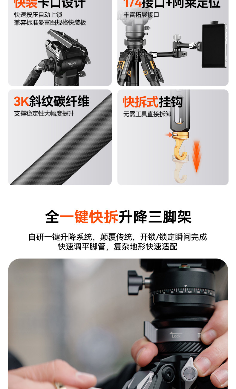 腳架採用高品質碳纖維製造,相比傳統鋁合金更輕、更穩,長時間拍攝亦不易疲勞,同時具備優秀抗震能力。