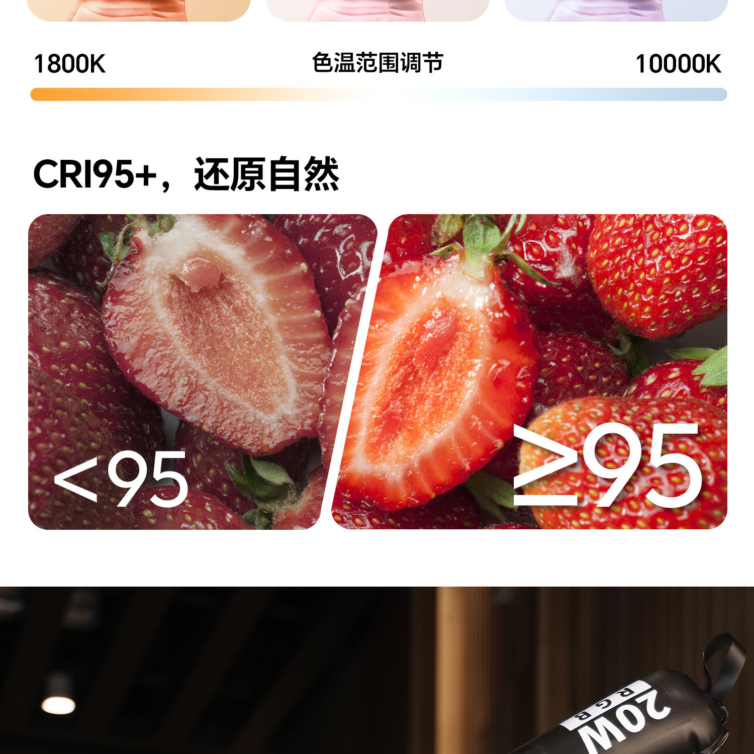 人像與產品攝影:寬廣的色溫(1800K-10000K)能勝任從暖色溫(模擬夕陽)到冷色溫(模擬陰天)的各種環境光模擬;而20W的大功率則保證了足夠的亮度。高顯色指數確保產品顏色不失真,很適合電商拍攝。